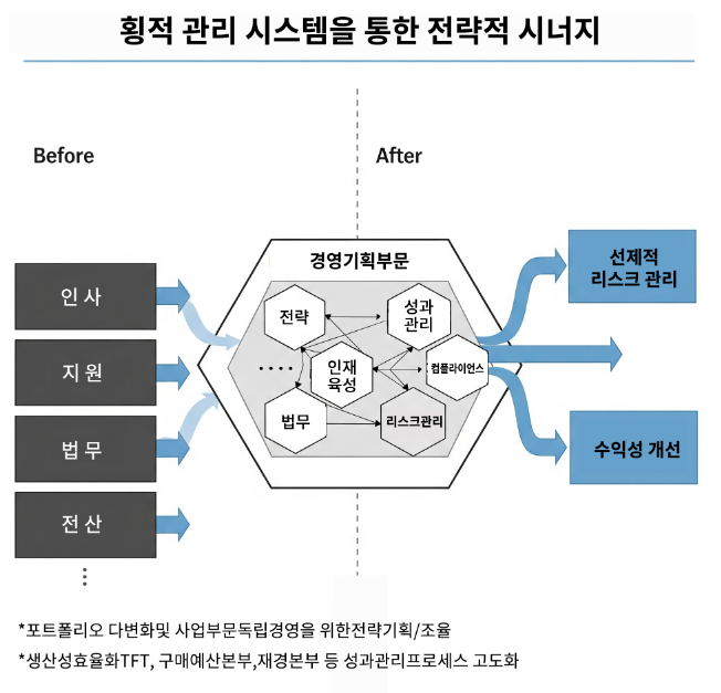 기능들의 단순한 물리적 통합이 아닌, '횡적 관리 시스템을 통한 전략적 시너지'를 목표로 합니다. 경영기획부문은 전략, 성과관리, 인재육성, 컴플라이언스, 법무, 리스크 관리라는 6대 핵심 기능에 집중하게 됩니다.